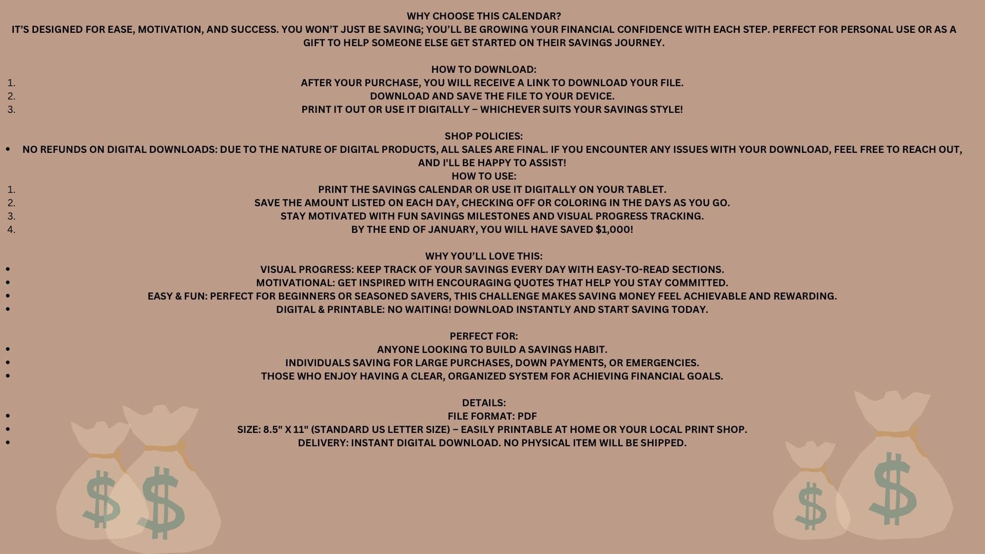 Kickstart your savings journey with this Digital January Savings Calendar! Designed to help you save $1,000 in just 30 days, this printable calendar breaks down daily savings amounts, making it easy to stay on track and hit your financial goals.